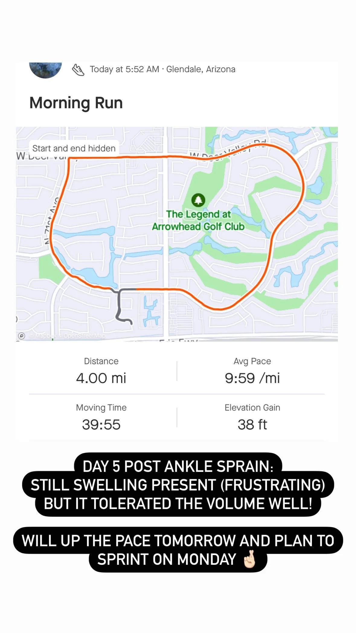 Day 4: Continued quick progression in terms of function. Started to incorperation multi-planer and single leg Plyometrics. It was a feeling pretty good, but still a little cranky with more impactful ground contacts. I was able to jog 2 miles, but the first mile was pretty achy when left leg was trail leg and Dorsiflexion was required. 2nd mile felt good.