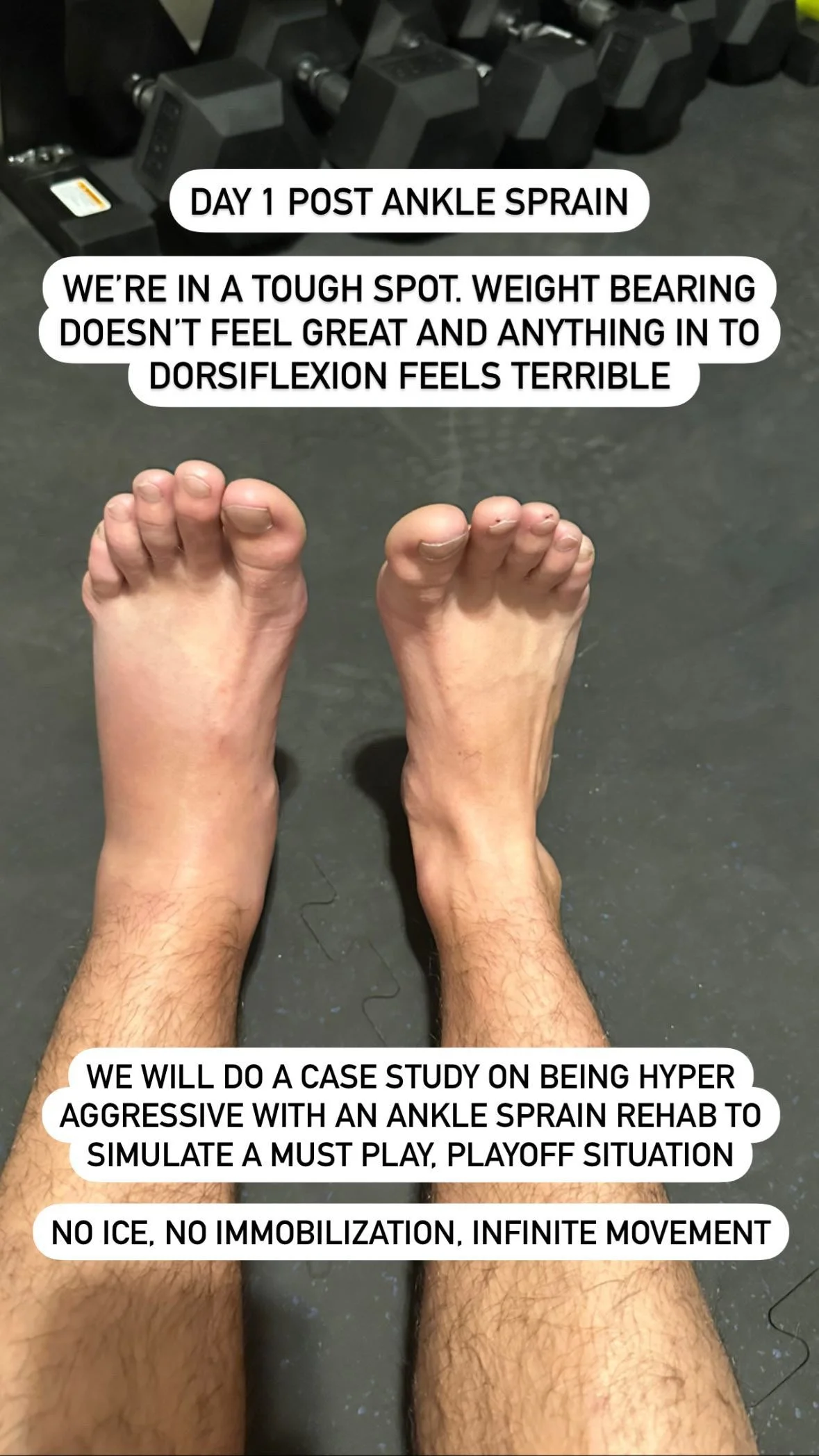 After a recent ankle sprain playing Pickleball (Ya, thought about not including the embarrassing mechanism of injury haha), it gave me an opportunity to do a case study on myself and test a theory I have had for some time now which is that a hyper aggressive management of an Isolated Lateral Ankle Sprain would have better outcomes than following the Acute Stage RICE Protocol. My reasoning for this was from seeing patterns in pushing early return of Range of Motion and activity in athlete’s that I was rehabbing was having a strong correlation to a much faster return to play “Norm” of 3-4 weeks for a Grade 2 (ish) ankle sprain and a smoother rehab overall. The fact that it happened to myself allowed me to use a Hyper Aggressive approach without using pain as a guide. Important to note: Ottawa Ankle Rules were negative so there was little concern of Fracture. (Look this up before using an aggressive approach)